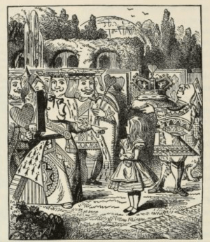 Repainting the Roses. Carroll’s original drawing on top, and Tenniel’s’ published version below.