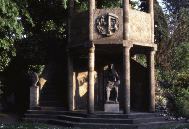 The circular sculpture – technically a tondo- shows Sir Frederick in his office and Lady Gibberd weeding with the gazebo in the background. Sir Frederick commented: “I rehabilitated the Gazebo – made by John Blackshaw [a previous owner] and his daughters out of sand and gravel dug up on site. The thatch, a refuge for sparrows, was replaced by a concrete pyramid. John Blackshaw’s ingenuity was not just in the design of the Gazebo. He uses it to change levels.”