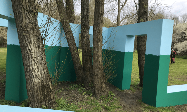 Beyond the Temple lies an area of the garden only recently incorporated into the overall scheme. Liable to regular flooding it has been planted with moisture loving trees, notably willows and birches, and, I think, is going to be the home for more large scale sculpture. The first occupant is Krijn de Koning’s site-specific piece entitled Green / Blue.
