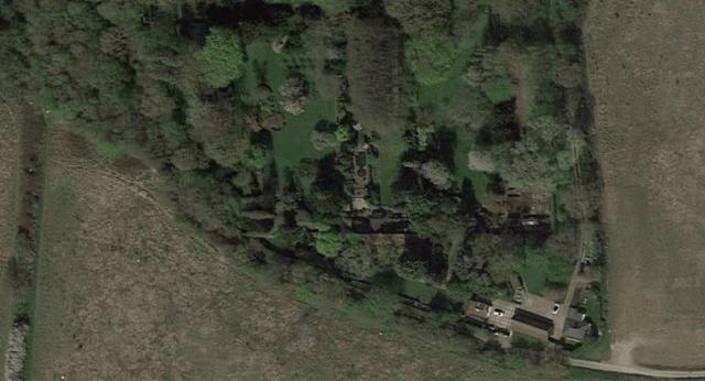 from Google maps from Google maps. The entrance courtyard and service buildings can be seen in the bottom right corner, and the house roof can just be made out towards the centre of the shot.