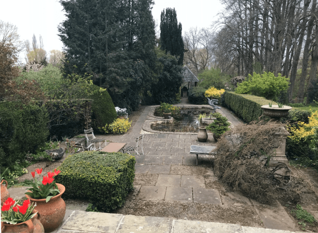 Turning right off the path at the end of the house leads the visitor to another of what Historic England in its register listing calls “formal gardens” around the house. I confess that to me that like the word estate implies something far grander than the reality. Full of sculptures it’s centred round a narrow canal with a rather strange little sculpture/fountain which forms a focal point from the window in the end wall of the house.