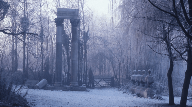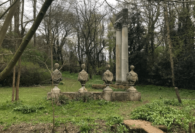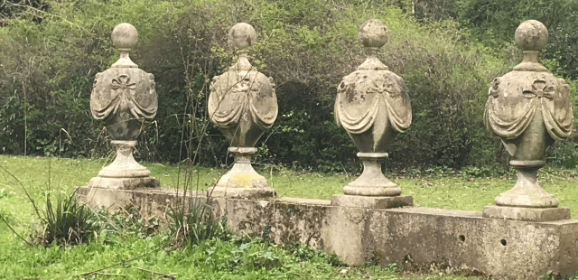 Having got them on-site “the temptation was to place the columns as the focus of a vista in the 18th century manner, but being only 22 ft high they would have been lost against the ash trees in the background.” So instead a pair of them were placed to one side where they can almost be missed if approached from the wrong angle but where they dominate from others. A set of four coadestone urns from the demolished pediment were “mounted… on blocks from the frieze to increase the scale and give them unity.” Despite their much smaller scale this grouping have almost as much visual impact as the columns.