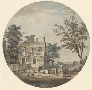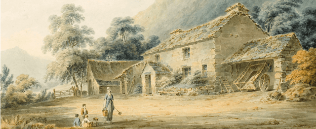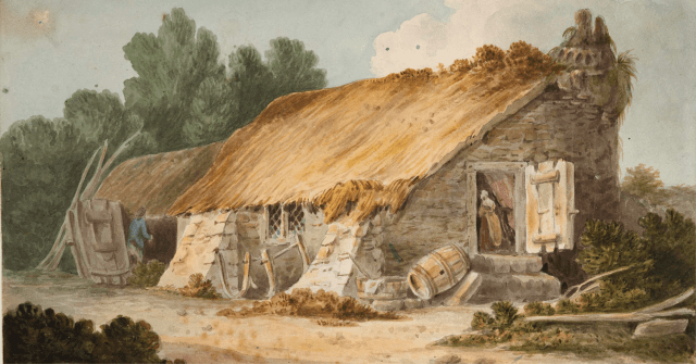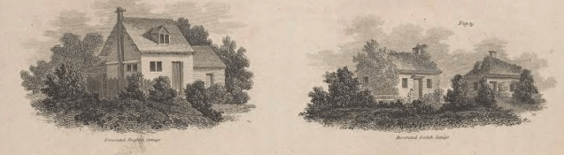 With 10 years the mood is shifting noticeably in the direction of Bernard’s reforming ideas, and is taken up by John Claudius Louden in his 1806 Treatise on Forming Improving and Managing Country Residences. He manages to reconcile the need for practicality for the cottager with the desire of the owner for picturesque. The cottage, and its outhouses etc should be “made for the purpose of utility by the cottager; but [for] the painter they [should] serve to connect and harmonise the whole.” He goes on to describe “the decorations of their little garden, and the planting of roses, or some of the smaller fruits, against the pales which inclose it. And now, proud of this little spot, [the cottager] would erect a seat close under the roof and at the side of the door, on which he may sit with his children after the close of his labour, and enjoy the general effect of the whole.”