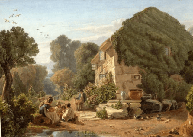 Yet there are almost no paintings or other images of cottage gardens at this time, and pictures of cottages even where they do exists tend to be the more upmarket picturesque ones rather than those of the labouring class. Loudon even calls such places “ornamented cottages” and describes how “in place of enclosing a plot of cabbages from the depredations of straying cows it now encloses a parterre from the bite of sheep.”