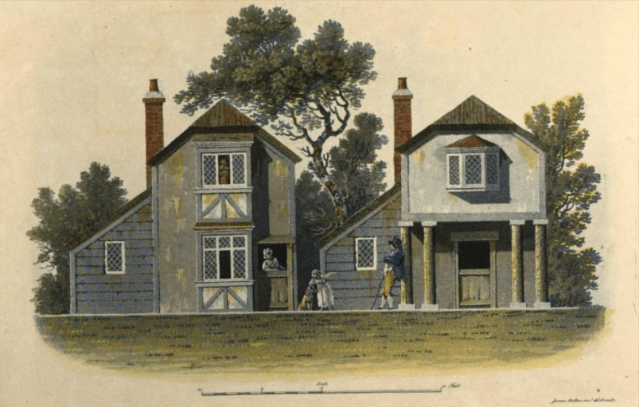 James Malton published an essay on British cottage architecture in 1798 driven he said “by a desire to perpetuate… the peculiar beauty of the British, picturesque, rustic habitations; regarding them, with the country church, as the most pleasing, the most suitable ornaments of art that can be introduced to embellish rural nature.” Malton goes on to offer a whole series of designs suitable for the landowner to choose from BUT what is significant is there is no mention of gardens at all. The word doesn’t feature in the whole book! Perhaps because as he says of extra living space inside “Too great possession becomes irksome to the possessor.”