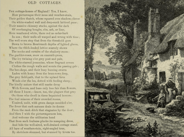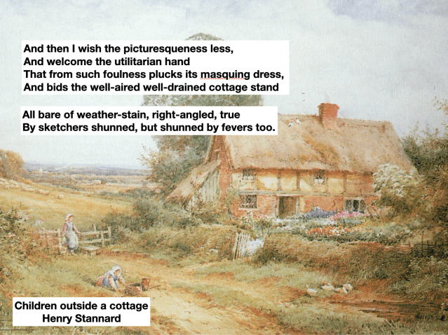 It begins well for the cause of reform, with their complaints being summed up in 1862 by Tom Taylor in his poem on “Old cottages.” As you can see from the image below it’s a page long and I don’t intend to quote all of it but some lines are worth highlighting, which I’ve done later by adding them to images of paintings.
