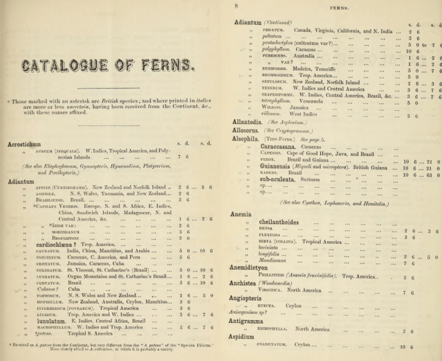Alternatively they could turn to a number of specialist fern nurseries growing for the market and also importing them from all round the world. Just look at the range of origins of ferns from the first page of the Backhouse catalogue of 1857. It has eight double pages of ferns but only one of orchids.