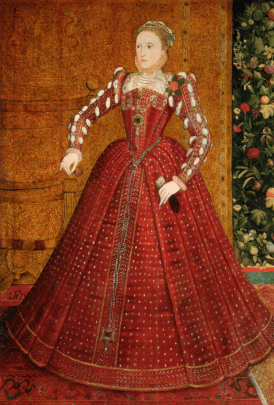 Elizabeth is portrayed in red and white. The colour combination is highly significant and refers back to the union of the house of Lancaster with the house of York achieved by the marriage of her grandparents, Henry VII and Elizabeth of York. Tudor green is also prominent.