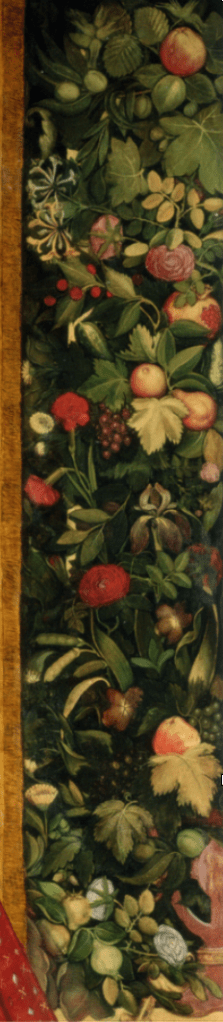 However the most obvious symbolic area of the picture is the background to the right of Elizabeth. This is a prominent reference to her marriage potential. She chose a decorated tapestry with flowers such as honeysuckle and with some of the fruits carefully arranged in pairs. Elsewhere in the tapestry there are ripe open pomegranates and even peas about to burst out of their pods surely designed as symbols of fertility.