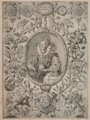 She is also seen in the last years of her reign as Rosa Electa by William Rogers surrounded again by branches of both Tudor and Eglantyne roses.