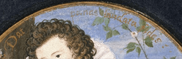 So after all that what are we to make of Nicolas Hilliard’s Young Man among Roses? Like the portrait of Henry Percy, which I’ve written about previously on here, this picture is more than just a picture. It’s an impressa. This was described by the Elizabethan chronicler and historian William Camden as “a device in pictures with his motto or word born by a noble or Learned personage, to notify some particular conceit of their own.” I’d suggest that the “conceit” here revolves around the aspirations of a lovelorn gallant in the language of the Elizabethan court: a visual love poem in miniature.