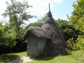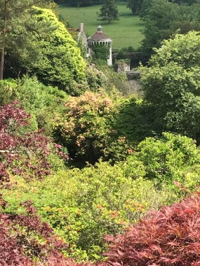 Below the bastion paths lead in several directions down to the lower levels of the garden and the old castle. One runs between the edge of pasture and the shrubbery on the slopes, and has several mature specimen trees, as well as passing the thatched ice house.There are branches off that that lead into the wider parkland. Others go down through the quarry garden, or along its western side.