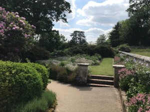 The walled kitchen garden was finished around 1840 to an unusual octagonal design. There is a surviving vinery/glasshouse which is in a pretty parlous state and awaiting restoration. There are wall trained fruit trees and areas set aside for soft fruit, vegetables, herbs, – which get used in normal times in the cafe and cutting beds to provide flowers for the house.