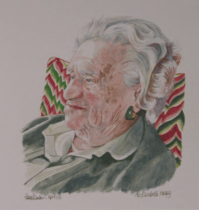 Mrs Hussey and the lime tree, put back in its hole, pollarded and flourishing. image from Shades of Green