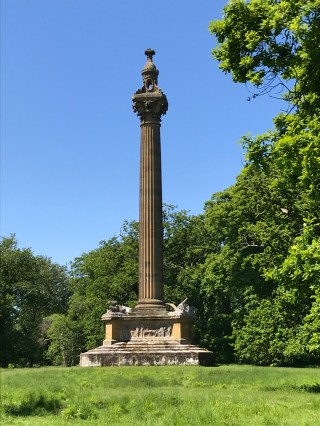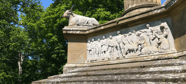 After Thomas Coke died in 1842 a public committee was established to organise and finance create a suitable tribute. It was decided to replace the north lodge which stood at the end of the long axis across the estate with the Leicester Monument. Designed by William Donthorne and paid for by Coke’s tenants and friends it is a Corinthian column standing on a large square plinth with an inscription on one side and bas-reliefs inspired by some of the earl’s work on the other three.
