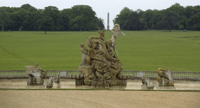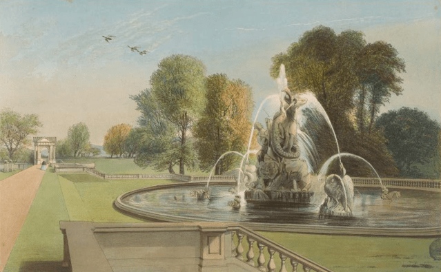 “The south front of the house is of a magnificent character, displaying to perfection the masterly design of its construction. The flower beds are all in sunk pannels, intersected by tracery and scroll-work, flanked by ” ribbon borders,” and ornamented with urns and vases filled with flowers ; two of the former of a large size, inscribed with the letters L. L. in bass-relief, being by Raymond Smith. Broad and extensive gravel walks, with stone borders, run in parallel and angular lines across its surface ; and at the bottom of the principal walk, leading from the centre of the building, is a grand characteristic fountain, by Raymond Smith, of St George and the Dragon, carved in the finest description of Portland stone.” This is the garden still seen today.