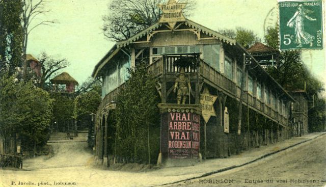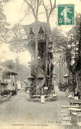 Eventually in 1888 Gueusquin’s son changed the name of Au Grand Robinson to Le Vrai Arbre de Robinson – the Real Robinson Tree – to stand out from its competitors, especially the Grand Arbre which stood opposite. By then the entire neighbourhood – now rejoicing in the name Robinson – had become an entertainment attraction with dance venues, games, rides, donkey races, a firing range and other diversions as well as eateries and bars. Later there was even a scenic railway.