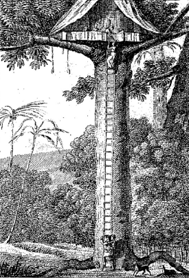 Well…. Rusticity – the kind of “basic” architecture that flourished before “proper” architecture – did not go away. It tied in very neatly with the ideas of Jean-Jacques Rousseau about the simple and uncorrupted lives led by primitive man, ideas which helped underly the romantic movement. It also tied in neatly with the ideas of untamed nature in both the landscape and the garden promoted by Uvedale Price and Richard Payne Knight. However, unlike the “noble savage” he admired Rousseau didn’t live in a treehouse but one group of people who did appear in a book written in 1812 by Johann David Wyss which you are quite likely to have read as a child.