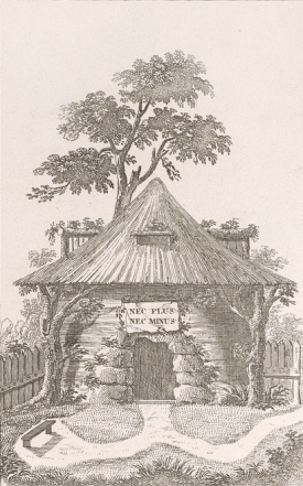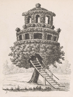 The idea took hold in Europe, especially France, while at the same time more traditional French garden designers were incorporating rustic ideas into their pattern books. Just a few years later Louis-Eustache Audot for example suggested a range of “primitive” small garden buildings including a house built round a tree, and this leafy tiered treehouse.