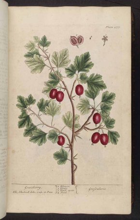 Lets start with some early history. Gooseberries or groiselles appear in the 1533   Introductorie for to lerne Frenche  and the royal accounts show that Henry VIII bought bushes of a pale Flemish variety. Gooseberries must soon have been considered garden-worthy  but perhaps not for their fruit.  For example in 1577  Barnabe Googe, in Foure bookes of husbandry, noted they were  “nowe a comon bushe vsed for enclosyng of Gardens, and makyng of Borders and Herbers: it wyll easyly growe, but that it is somethyng troublesome, by reason of his sharpe prickles to be bent about sommer houses.”