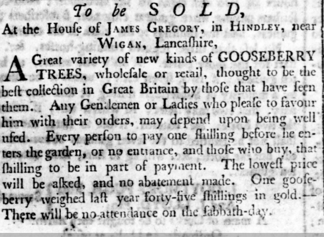 Later in the 18thc its clear that  interest in gooseberries  was growing particularly in  the  midland and northern counties, notably Lancashire and Cheshire, and also in Scotland.   Lancashire gooseberries became highly prized, almost like a top brand name.