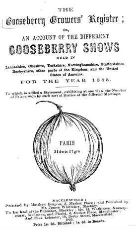By 1786 there were so many groups and shows that The Gooseberry Growers Register began to be published in Manchester listing details of the shows, the prize winners, details of winning fruits especially their weight  and news of  new varieties etc. The societies reached a peak in the mid-19thc  with the register listing 171 shows in 1845.  Later it even included shows in the United States as well.