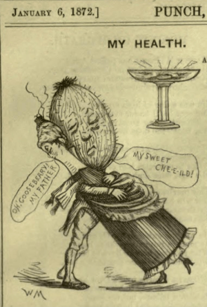 It’s also clear that gooseberries were used for home brewing, from at least the early 18thc. Richard Bradley declared wine made from them  “one of the richest and strongest Wines made in England; and is not, in my opinion, inferior to Mountain Malaga.”   But it acquired a reputation later for  making a champagne substitute,   but in the process  a byword for inferior. Thackeray, for example, wrote of someone  who “pronounced the champagne to be condemned gooseberry.”  Punch cheekily suggested in 1872 it was the other way around!