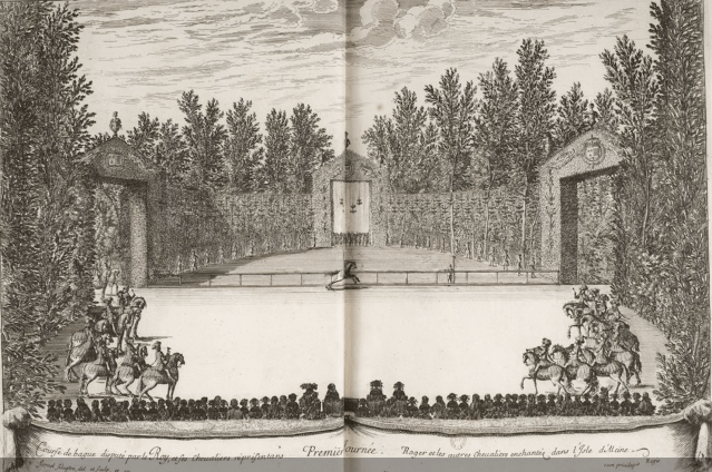 It was a fairy-tale come to life. The gardens newly laid out by Le Notre were illuminated while orchestras played as the entertainment started with a magnificent parade. Heralds led the way followed by pages, and squires, who carried banners and shields on which were written laudatory and romantic verses. Next came competitors in the races and then knights on horseback. Then came Louis himself dressed in lavish fire-coloured garments for the leading role of Roger. It was reported that “all the diamonds belonging to the crown sparkled upon his clothes, and the horse which he rode.” He was followed by all the leading courtiers equally magnificently dressed who were undertaking the other main parts.