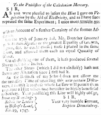 By 1747 he had experimented on the effect of electricity on plant growth and published a short letter on the subject in the Caledonian Mercury.
