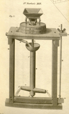 Many references to Dr Barker and his device, sometimes known as Barker’s Mill because it was later adapted to grind corn, suggest it is a 17thc invention. Although this might be possible – indeed Martin suggests it was invented “many year ago”- it’s more likely to have been devised or certainly substantially improved by Robert Barker a member of the Royal Society in 1743.
