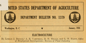 Meanwhile work in other countries including the US was less encouraging. The Department of Agriculture issued a bulletin in 1926 which concluded that ” a review of the literature of electrocultural experimentation up to the present time does not lend assurance of great progress.”
