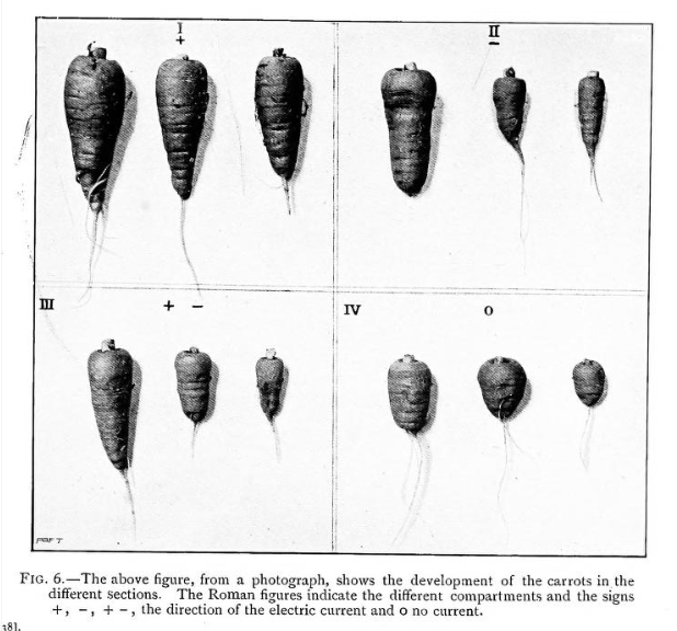 But things really start to buzz again in the 1840s when a whole new generation of experimenters, began to test out new theories and report their findings in serious journals. This was probably due to the invention of what was called an “Earth battery” by Alexander Bain in 1841. Bain’s device operated on the same principles as a modern battery except the zinc and copper plates were put into the soil and connected above ground by wires. Plants grown in the area between the two plates grew faster and yielded more. [Follow this link for more info in simple language on earth batteries, how they work and how powerful they can be]