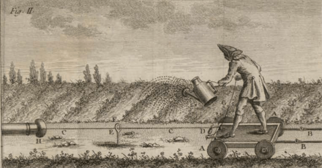 There were other French would-be electricians too, notably the Abbé Pierre Berthelon who had already written about the benefits of electricity and health, and other related subjects. Now he too tried watering plants with “electrified water” delivered from an insulated barrel on a trolley that could be trundled along by the gardener between the rows. In 1783 he published De l’électricité des vegetaux, which included a description of the first electro-culture tool: the electro-vegetatometer!