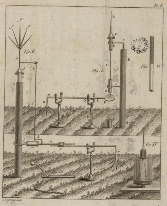 He set up miniature lightning conductors to collect electricity from the atmosphere and then distributed the charge via wires across the garden. Don’t ask how precisely – it was too complicated to read and translate 18thc technical French – but the image below should give you the general idea.