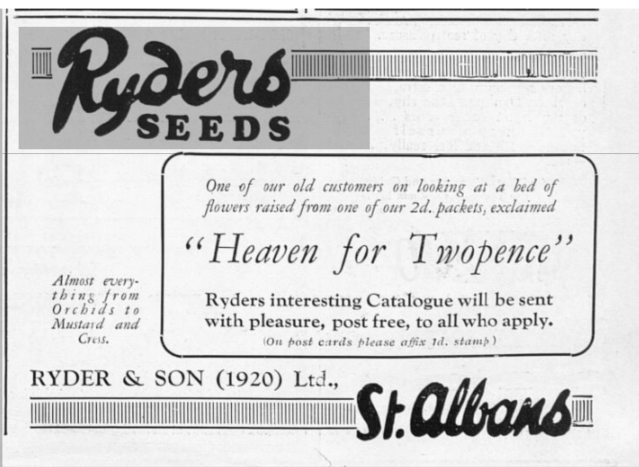 Pre-Covid I was looking for material for a post on Winifred Walker, the botanical artist and discovered that one of the companies who commissioned her flower paintings was Ryders of St Albans. That name sounded familiar but didn’t ring any horticultural bells so I set off down a side-track to see what was known about them too. It was well worth the detour.