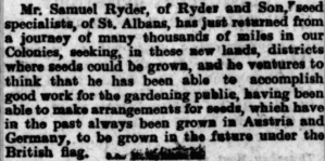 It appears that Ryder travelled the world including British Columbia and California, as well as many of the British colonies, looking for alternative places to obtain seeds which he had previously sourced in Germany and they began exporting overseas, although not on the same scale as their rivals Carters and Suttons.