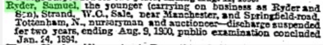 The partnership was dissolved by mutual consent in November 1890 – probably because Samuel senior retired – but despite the official announcement in the London Gazette that the business would be continued by Sam’s brother John Ryder and Alfred Jones, both described as nurserymen, it looks as if Samuel junior retained a stake in the company.
