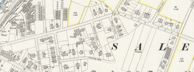 detail from OS 25″ Cheshire IX.11Revised: 1897, Published: 1898 The family lived in Wharf Road, at the left of the map, in 1871 and had moved Whalley Avenue on the right by 1881. There are several nursery grounds in between the two