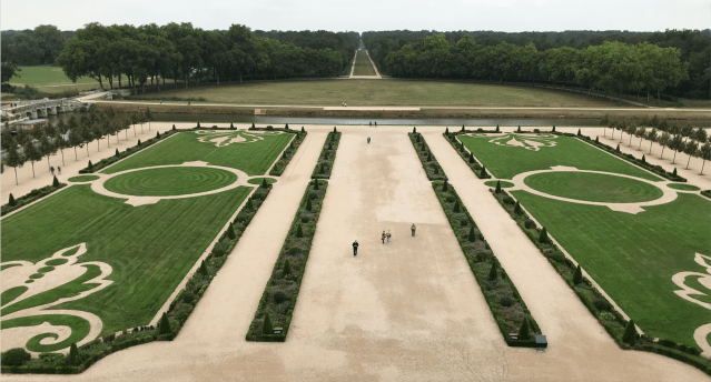 Despite all that looking down on these gardens from the chateau roof offers the visitor an impressive birds-eye view, although not as good as the images taken by drones! It’s very different, as Tim Richardson, points out, from the conventional rather static view of an 18thc parterre from the first floor window. So far I agree with him. He goes on to say that “At ground level, the simplicity of the parterre gardens creates a pleasing contrast with the fantastical roofscape of the château and the shapes of the yew topiaries seem playfully to echo the shapes of its towers and turrets.” There I venture to differ. The group I went with all felt the same: that walking through them, especially around the flower borders of the parterre’s, felt distinctly underwhelming. I hope it was just the season with the beds being ruthlessly cleared, but unfortunately I’m not sure.