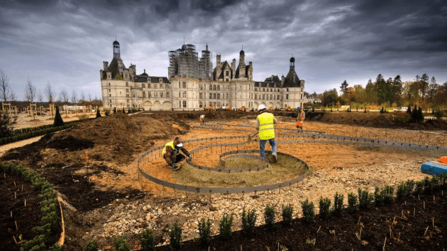It wasn’t until 2000, that the French Ministry of Culture starting consulting about possible ways of improving the château’s surroundings, and in particular the replanting of the gardens. Many different solutions were considered but in the end what was chosen was, according to the authorities, “an authentic restoration of the only structured and completed gardens that ever existed on the property”. Over the next decade or more documentary research, geophysical and archaeological surveys discovered the remains of a tiny mediaeval garden, and established the precise 18thc layout. The work, which cost €3.5 million, was largely paid for by Stephen Schwarzman, an American philanthropist and chair of venture capitalists Blackstone. The installation took just seven months and was completed in March 2017.