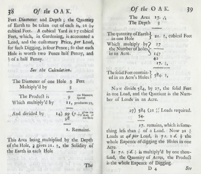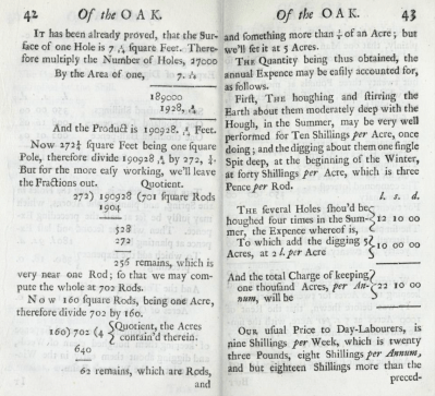 Apart from accounts of some simple experiments designed to work out the best growing conditions for trees, the bulk of the book is, like Sylva, divided into sections about each major tree species starting with the oak. But it also includes all sorts of detailed calculations reminiscent of old school maths exercises on the cost of digging planting holes, weeding, labour rates, interests rates etc etc before revealing that after 20 years the profit would be £4785.