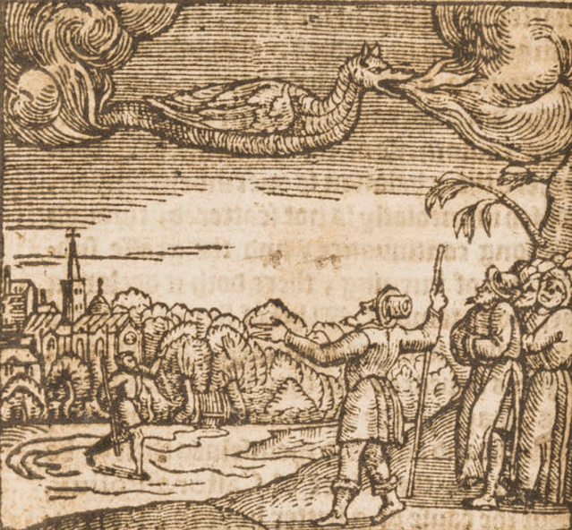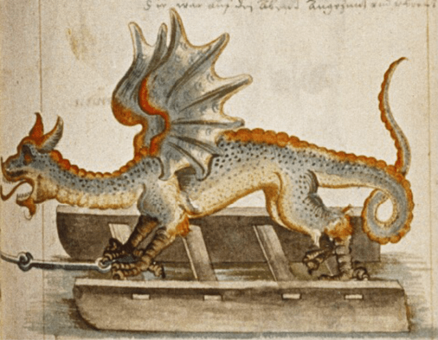 John Babington explains in his short book Pyrotechnia of 1635 that the dragon was hollow with a frame made of withies or the thin branches used by basketmakers, with a thick paper or pasteboard “skin”. Holes need to be pushed through to take rockets and a roll of paper attached to the back to take a rope or wire that runs between two pulleys…”which being done your Dragon is finished for firing.” He then gives detailed instructions about how to “first fire it at the eyes, and mouth, (alwayes noting, that this receipt must be some slow mixture, such as your starres) then fire that rocket which is placed with his mouth toward the tayle of the Dragon, which will make it seem to cast fire from thence, till he come to the end of his motion – and then on a sudden, as a creature wounded with some accident, shall return with fire coming forth of his belly, which being well ordered, will give great content.”
