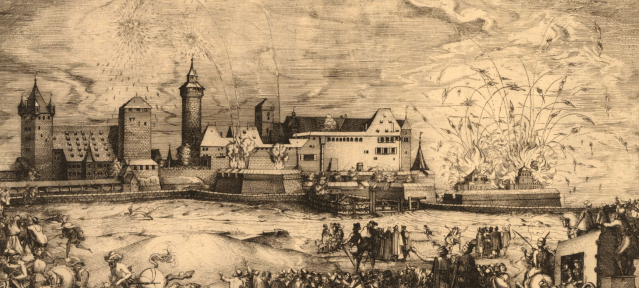 detail of Firework display at Nuremberg castle in 1570 to celebrate the entry of Emperor Maximilian II in the city;. On the right the two small temporary castles filled with fireworks. This is [I think] the first image in the west of a firework display