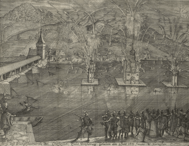 Some were lavishly hand-painted presentation volumes but with the invention of printing more and more were produced in much plainer, cheaper formats. Several thousand of these survive from all over Europe, including the largest collection of over 2,000 in The British Library. [The BL have digitised 253 of them which can be word searched and 45 have have specific references to fireworks.] Unfortunately there are only a few English examples with most coming from from the territories of the Holy Roman Empire where printing and engraving reached a high level of expertise at an early date and led to the production of many beautifully illustrated volumes.