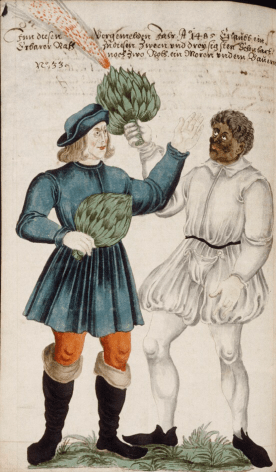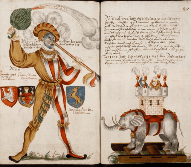 Unfortunately I can’t find much about the origins of the “Wild men” or “green men” casting fire, but it’s clear they became part of the ritual that went with such firework ceremonies and processions. They acted as a type of whiffler, someone who walked in front of important processions banquets and pageants to clear the way or to clear space for plays to be performed. They were often quite raucous and became a major attraction themselves, dressing in elaborate costumes and carrying swords, clubs and even fireworks.