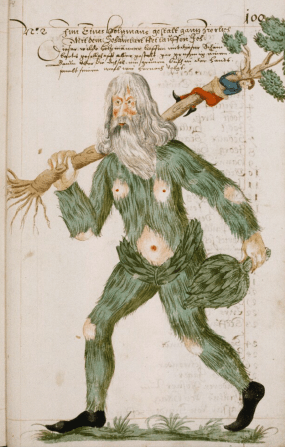 They’re mentioned in George Whetstone’s play History of Promos and Cassandra 1578 and there’s there’s a description in 1610 of them “in green ivy..,. with black hair and black beards, very ugly to behold, and garlands upon their heads, with great clubs in their hands, with fireworks to scatter abroad to maintain the way for the rest of the show. And even better there’s a woodcut of one in the first English book on fireworks John Bate’s The Mysteryes of Nature, and Art of 1635, as well as a series of drawings in German festivals books.