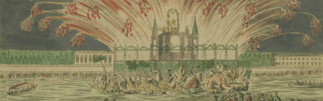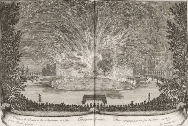 Louis of course was an old hand at commanding fireworks. I wrote recently about the work of Israel Sylvestre who recorded the Plaisirs de l’Isle enchantée – or the Pleasures of the Enchanted Island – the celebrations staged to mark the completion of the first stage of the work to the gardens at Versailles in 1664. These include plenty of fireworks culminating in the burning of the enchantress’s palace.