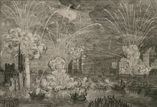 There was a lapse in firework celebrations in England during the Civil War and Commonwealth but they begin to return slowly in Britain with the return of Charles II in 1660.