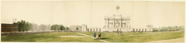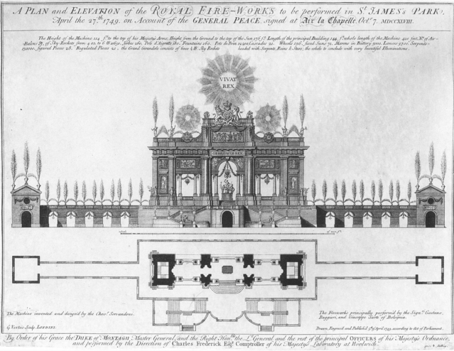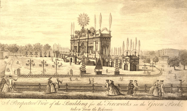The Royal Laboratory at Woolwich was in charge of manufacturing the fireworks, at the expense of £8000. A site was chosen in Green Park where a mock temple or “machine” as it was usually known was put up to Servandoni’s elaborate design. The fireworks were fixed by Italian pyrotechnists, although army engineers were also involved and there were quite a lot of disputes between the two groups about fuses and timings.