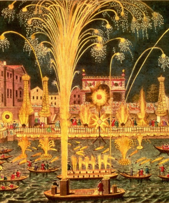 Fireworks were becoming an increasingly sophisticated art form in their own right, and by the mid 18thc could be spectacular in scale and extravagance as was shown by the display in London’s Green Park where Handel’s Music for the Royal Fireworks was premiered in 1749 [click on the links & you can hear it as you read!] Although not everything went according to plan as you’ll see if you read on…